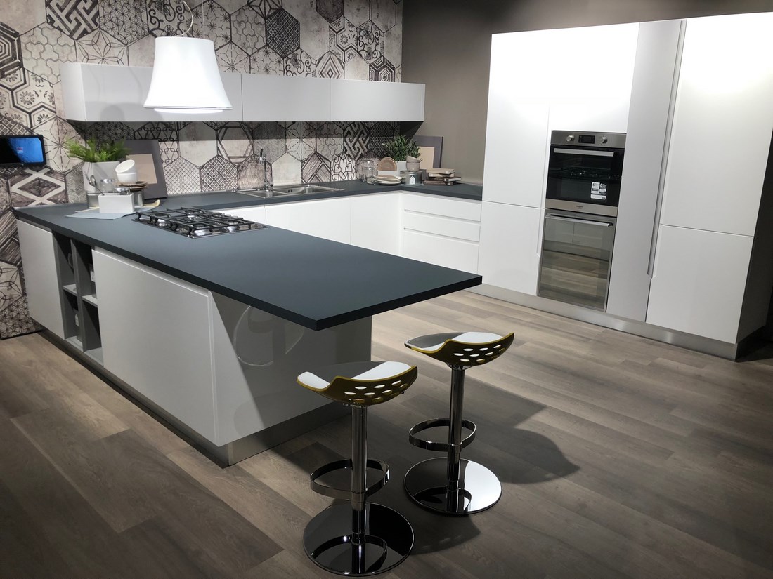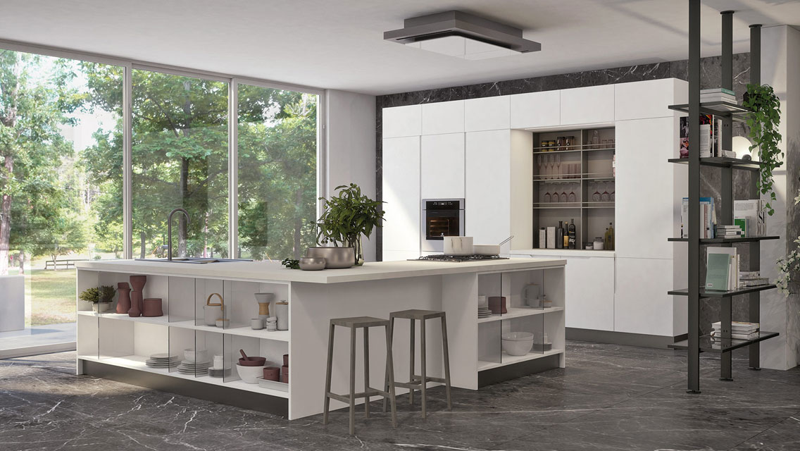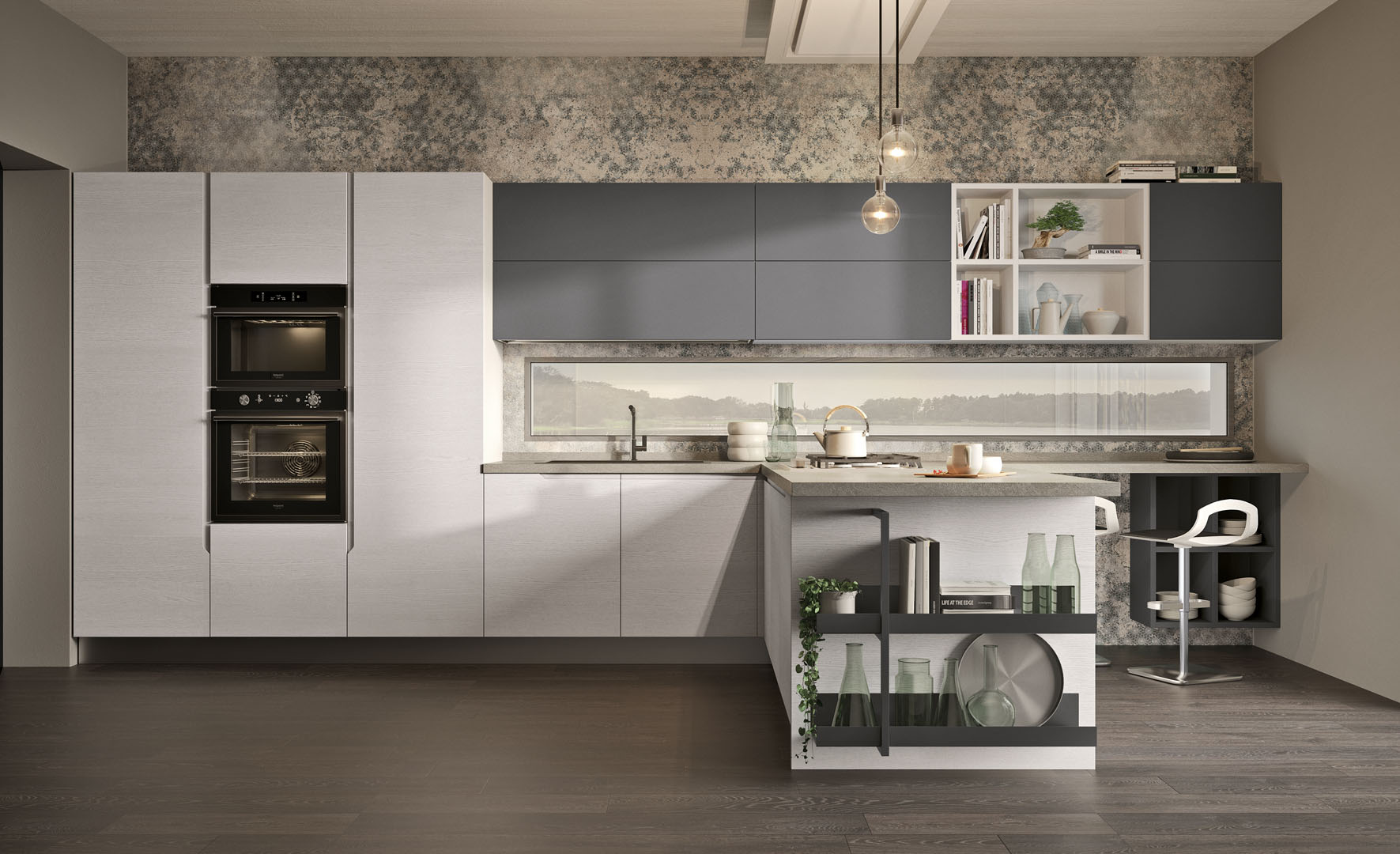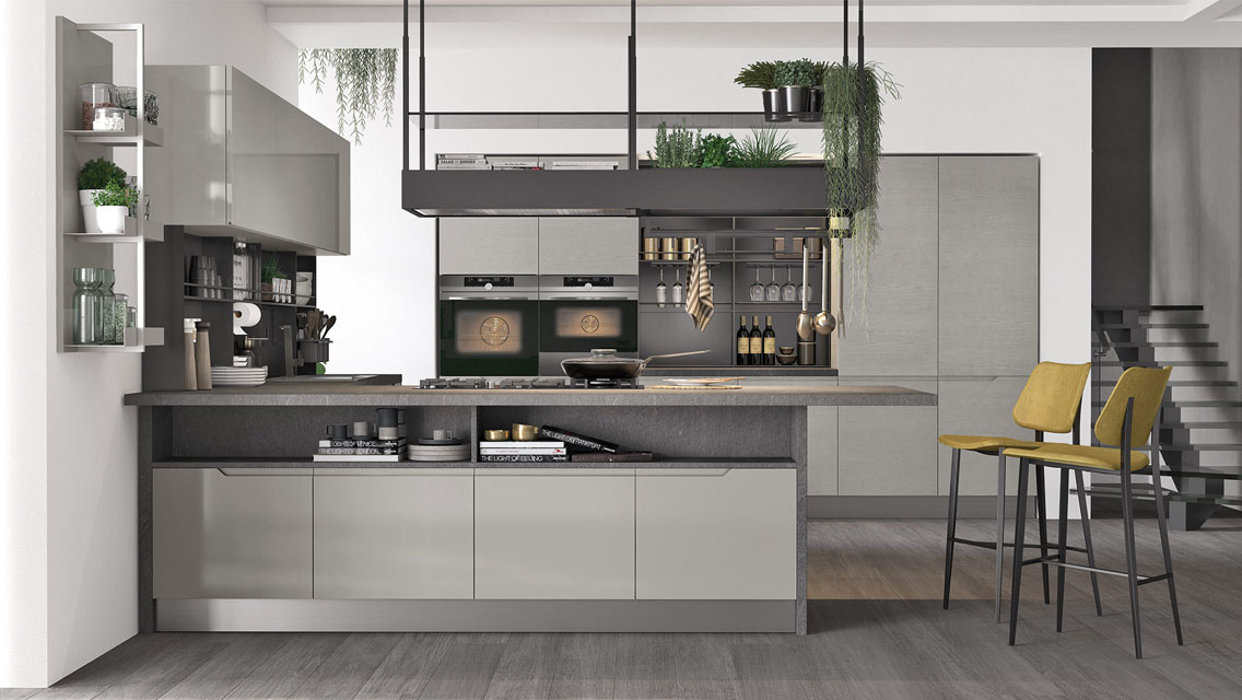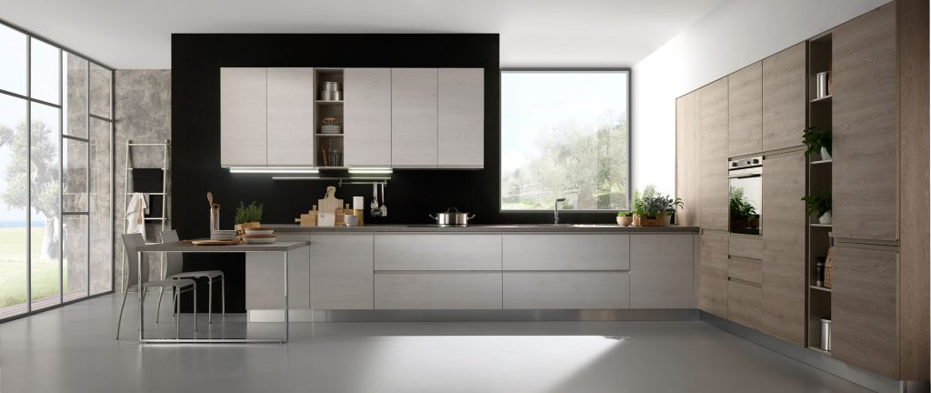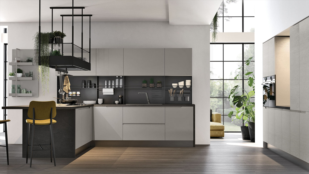 Soluzioni arredative dinamiche che rispecchiano lo stile moderno, pensate per incontrare nuovi modi di vivere lo spazio cucina. La presa integrata nell’anta forma un disegno modulabile che caratterizza i frontali della cucina con eleganza.
