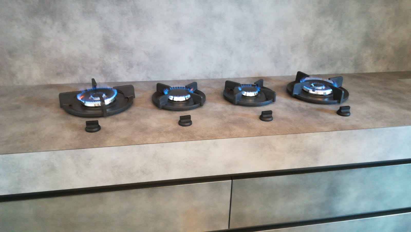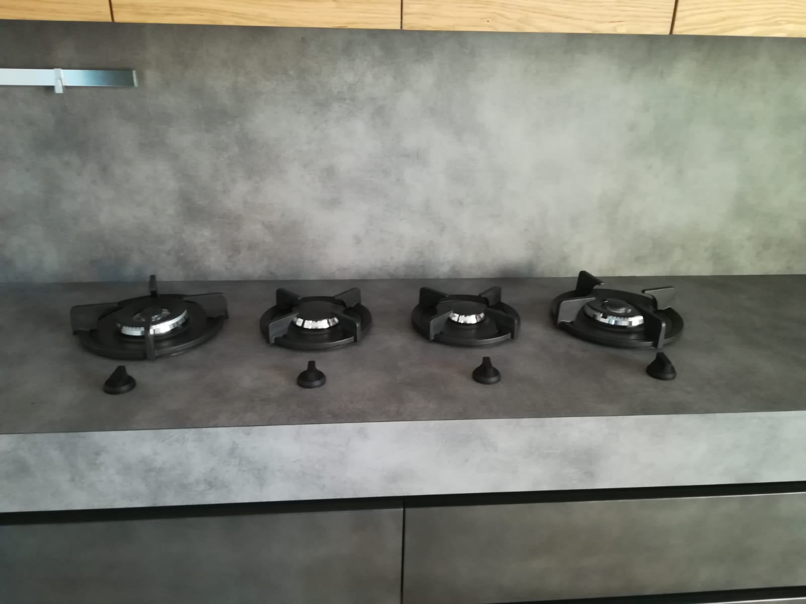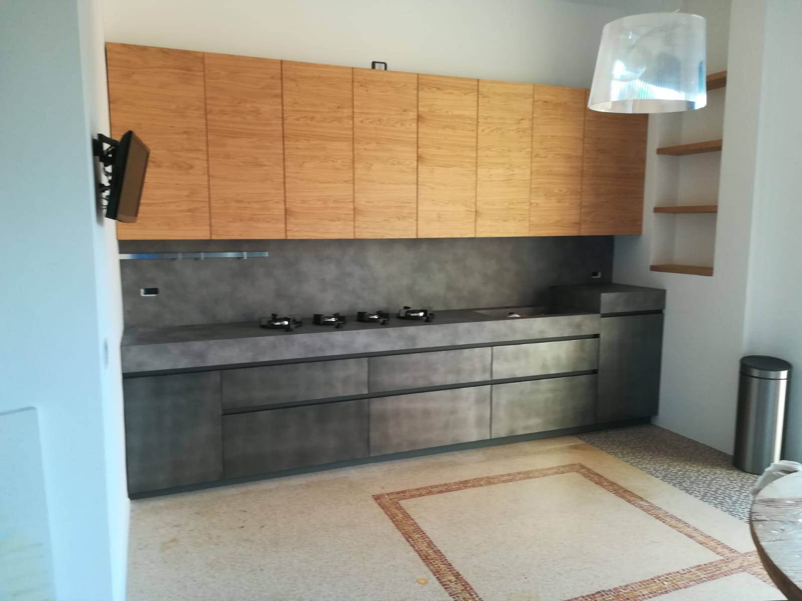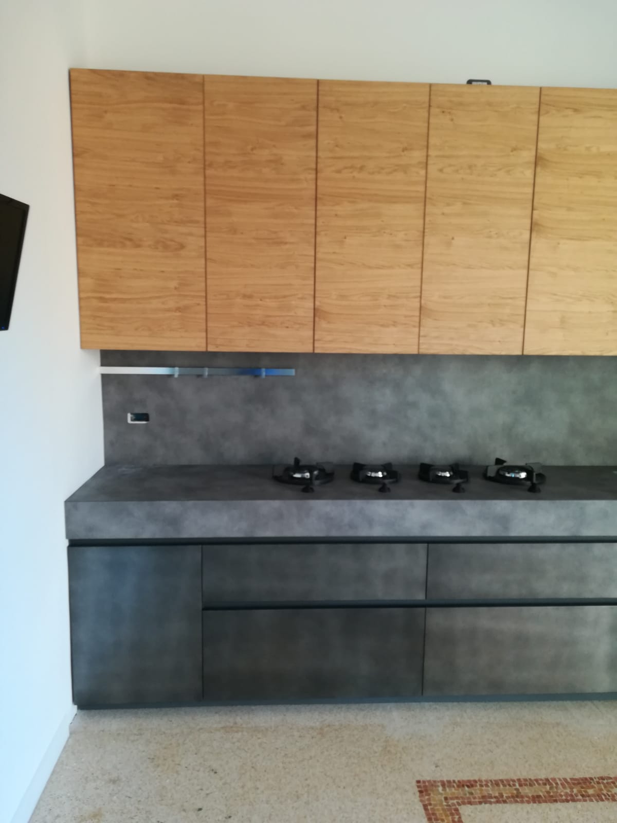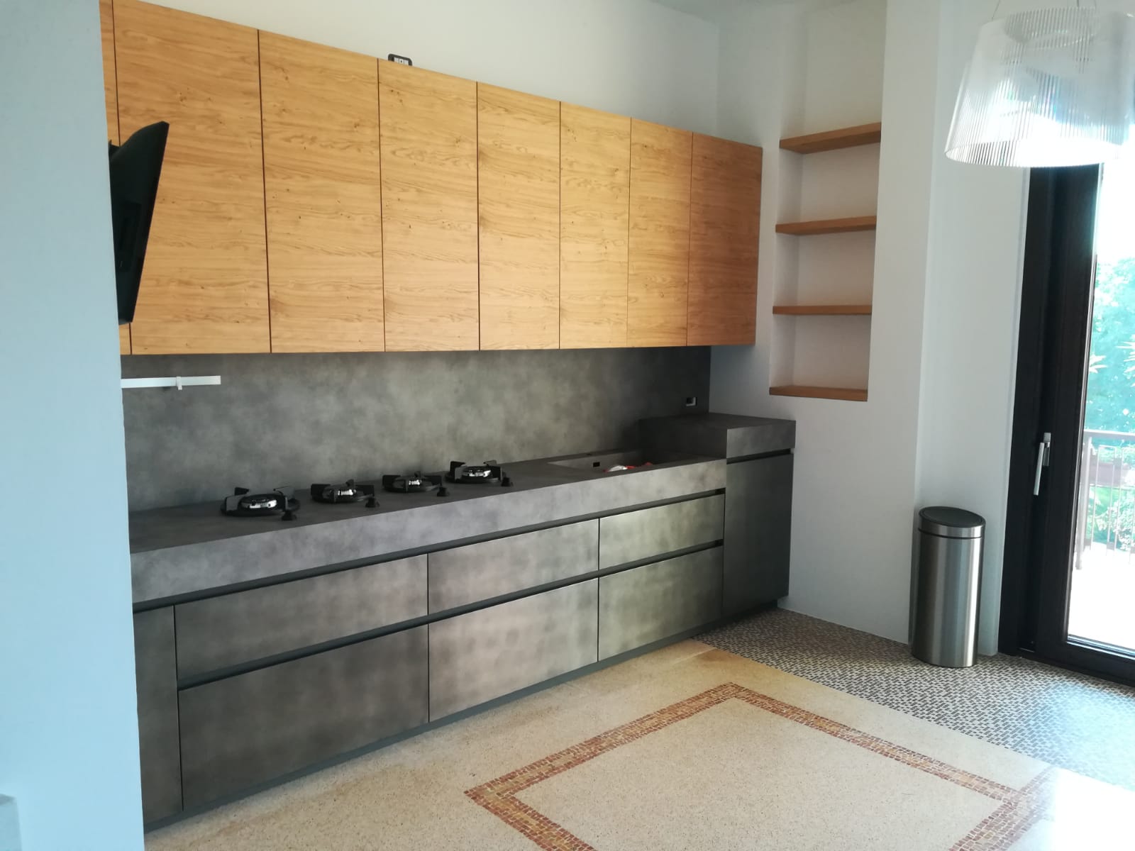La composizione modello Oltre della nostra cliente Caterina. Piccola ma tanto emotiva, dal carattere deciso conferito dalla suggestiva anta laccato Peltro, con l’innovativo Top in “Stratificato HPL” effetto cemento spessorato 11cm e resistentente fino a 180°, il tutto in contrasto con le ante dei pensili in legno di Rovere nodato